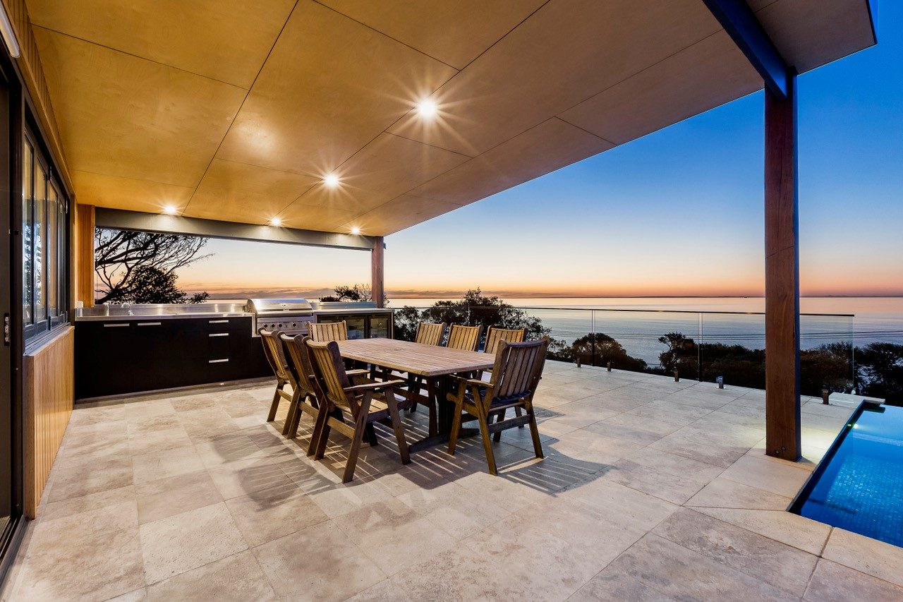 Designing the suspended concrete pool above the garage was a key challenge, demanding careful load management and waterproofing. The exposed site also called for structural resilience against strong coastal winds.