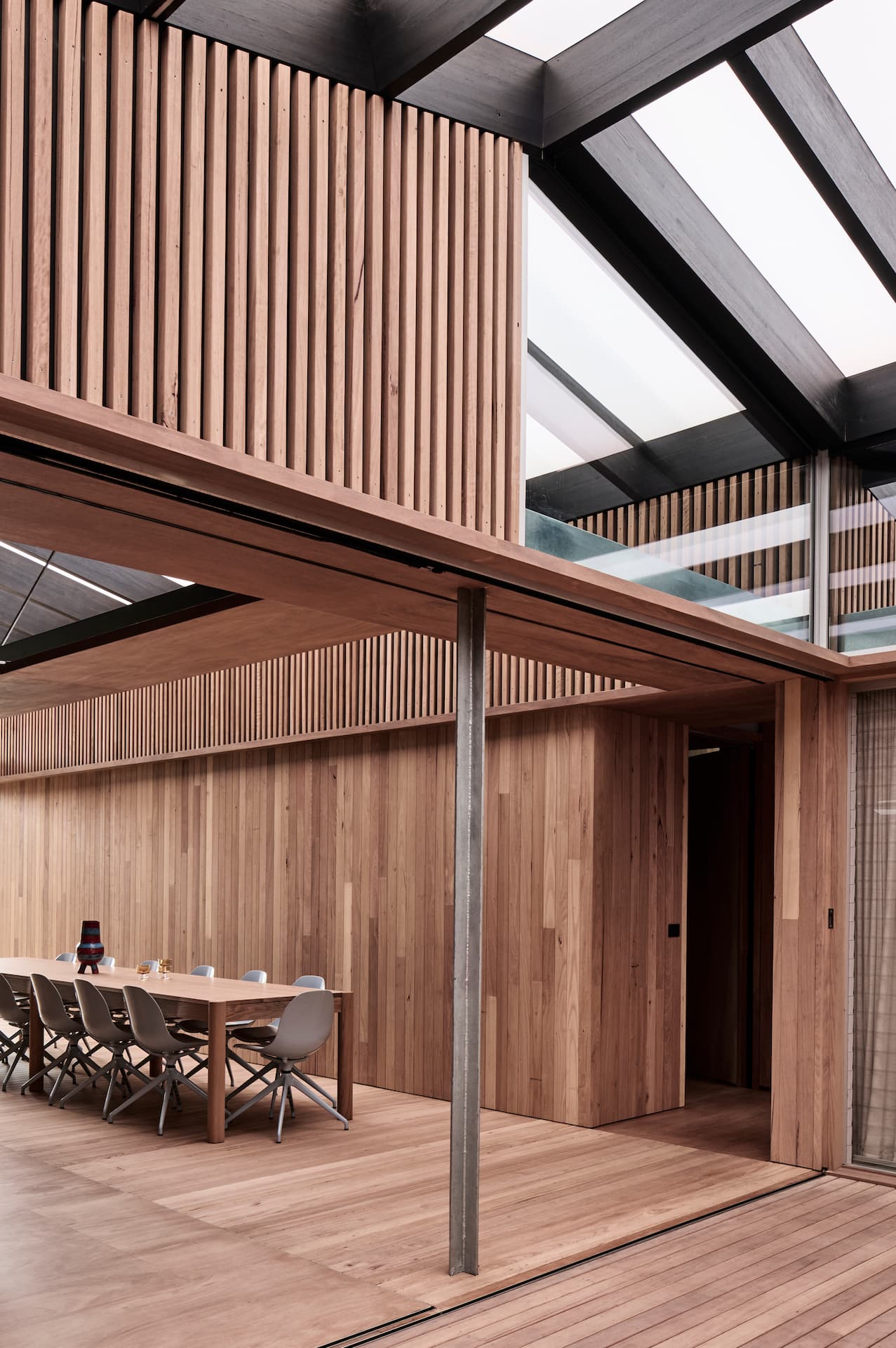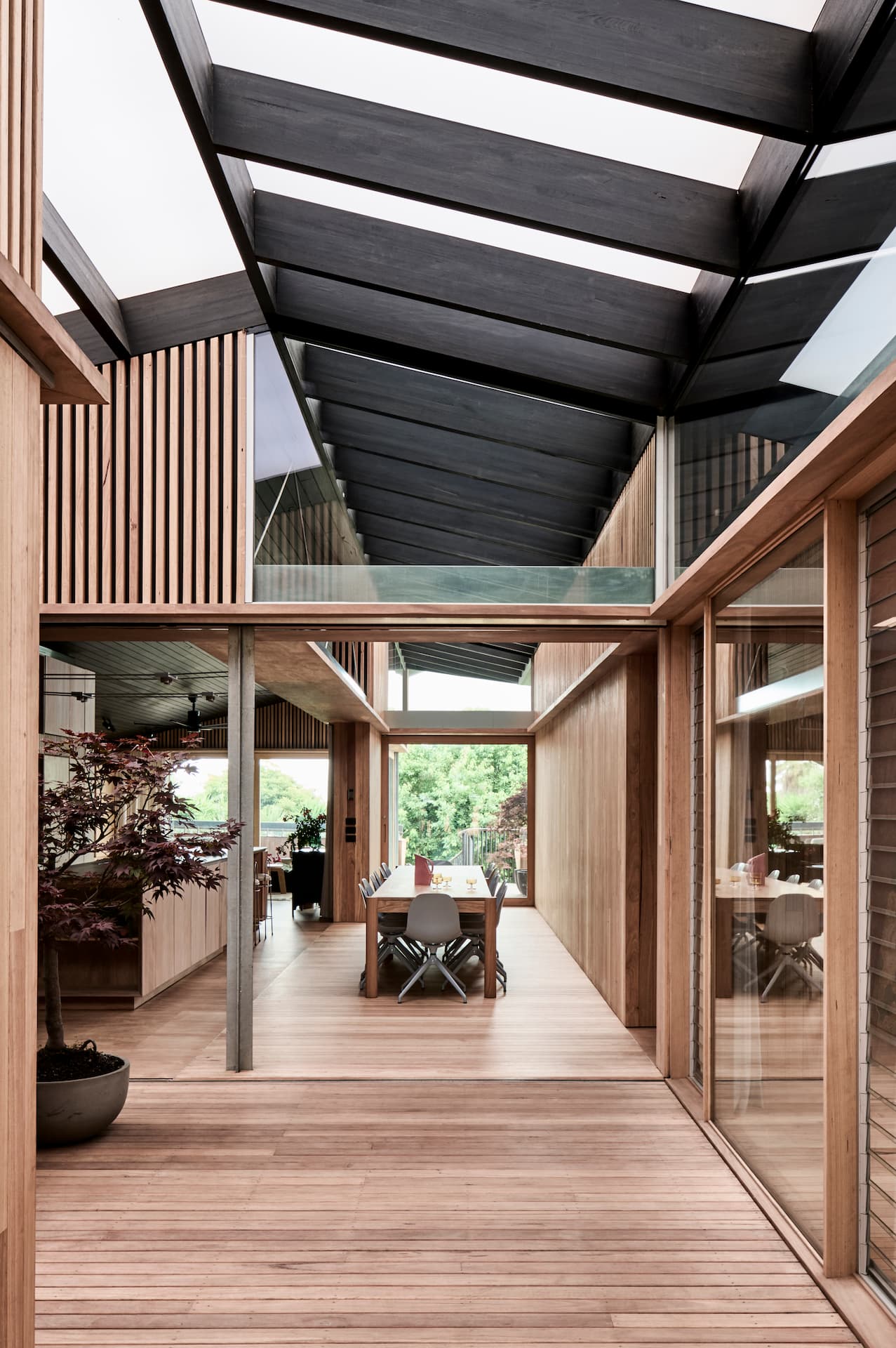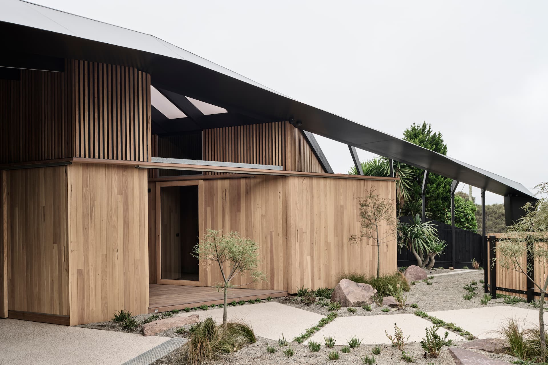 Engineered around a cross-axis layout, the structure balances form and function by aligning with key site orientations and creating a breezeway that adapts to climate. Timber cladding ensures material consistency, while the elevated form allows for a functional undercroft, reimagined as a sheltered garden that integrates structural efficiency with environmental connection.
